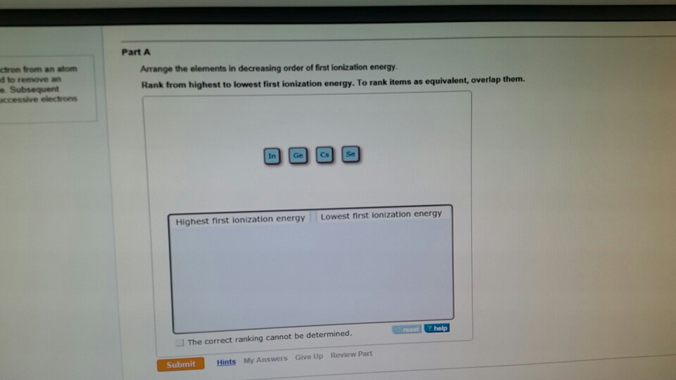 Rank these elements according to first ionization energy. For a hydrogen-like atom, classify these electron transitions by whether they result in the absorption or Ionization energy is the energy needed to eject an electron from an atom or ion. ... View Full Source